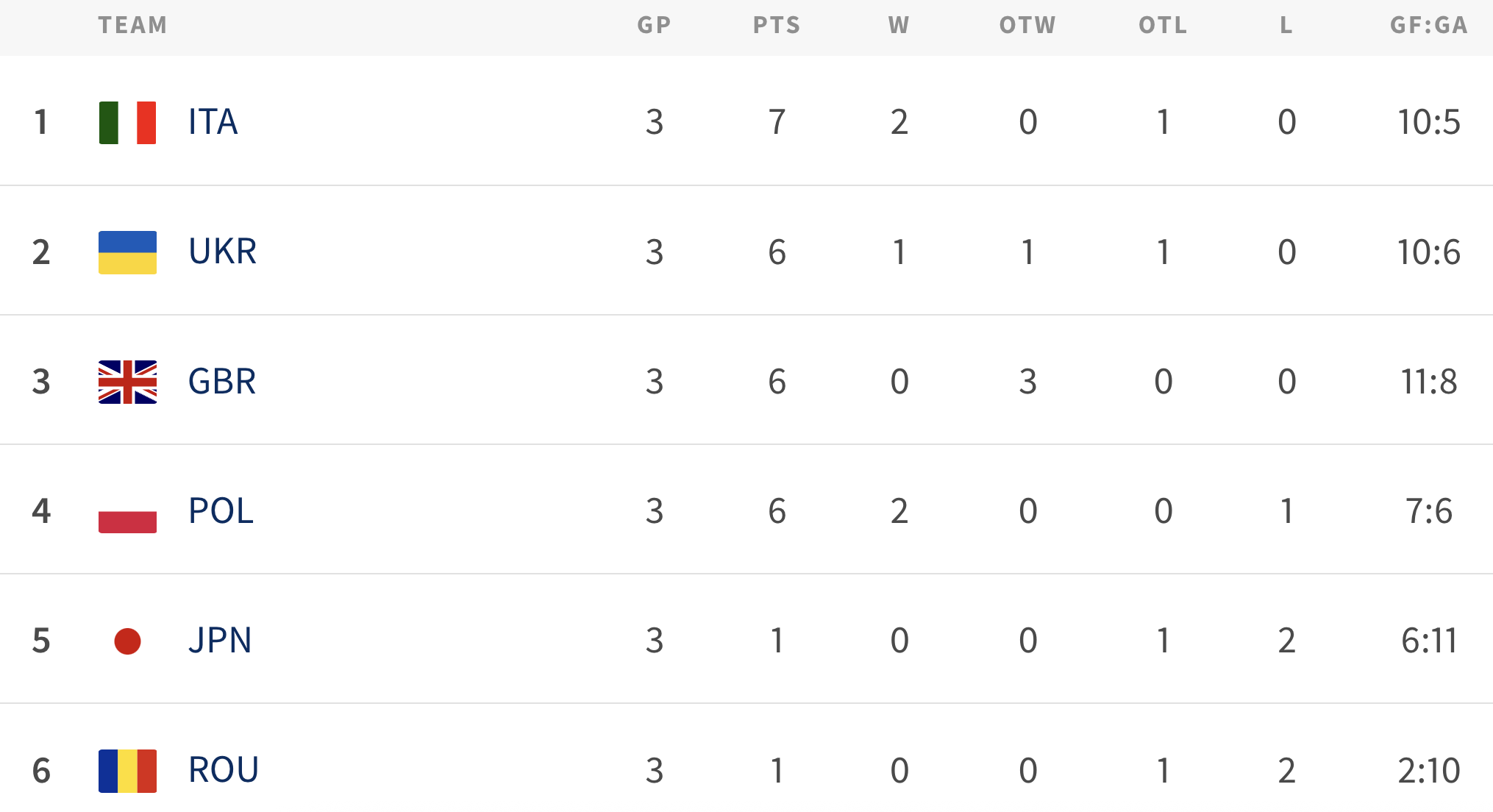 Первое место занимает сборная Италии, имея в активе семь очков. Вторую строчку занимает Украина с шестью баллами. Тройку лидеров замыкает сборная Великобритании с шестью очками.