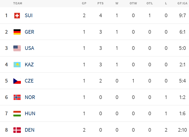 Группу "А" возглавляет Швеция, выигравшая оба матча на старте турнира. В группе "В" первое место занимает Швейцария, набравшая четыре очка в двух встречах.