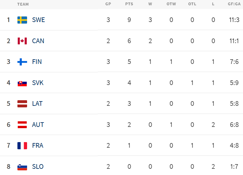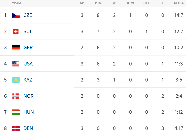 Швеция, обыгравшая Финляндию (2:1), возглавила группу "А", а в группе "В" на первое место вышла Чехия, разгромившая Данию (7:2).