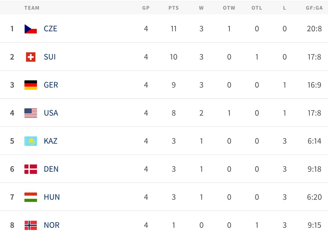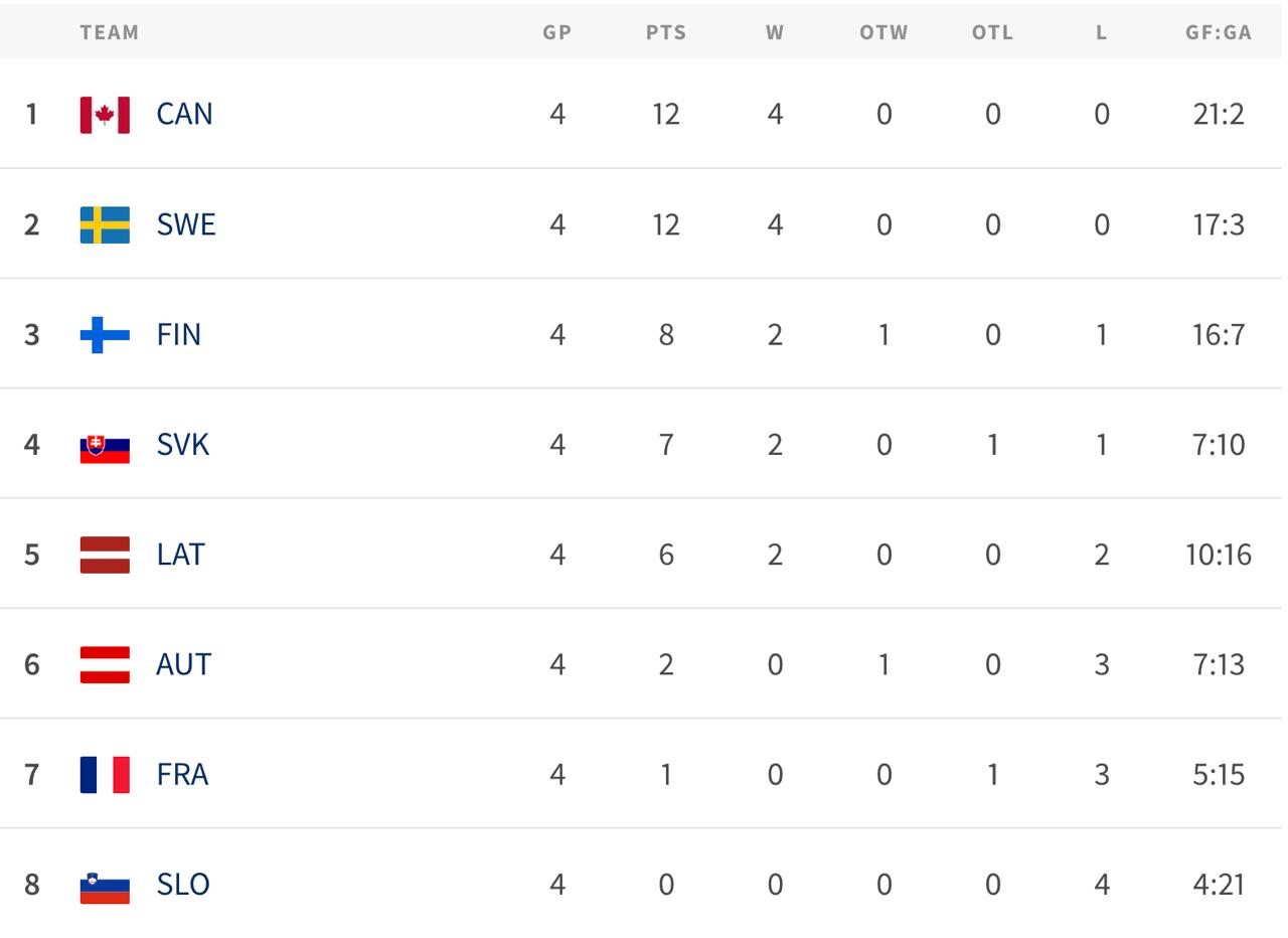 Группу "А" возглавляет Канада, одержавшая победы в четырёх матчах. Сборная Чехии с четырьмя победами в активе лидирует в группе "В".