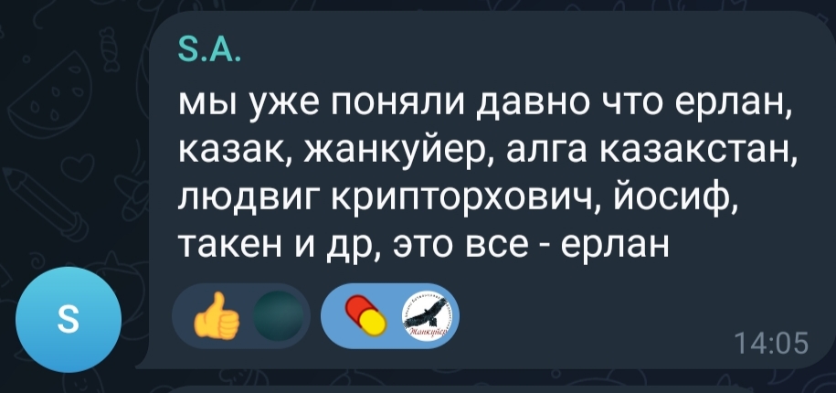 О, ещё один ник Ерлана что ли? Параноики )))) Для тех, кто не в курсе. В их чате я - самая распространенная персона для обсуждения. Там меня люто ненавидят. Забейте там в поиск мои имя и ники - и поисковик выдаст тысячи результатов, где меня обсуждают, матерят или просто вспоминают. Никогда не думал, что я стану таким знаменитым, пусть даже в отдельно взятой чате 🤣 Но и это не главное. Прикол в том, что они думают, что если кто-то в телеге или здесь думают не так как они, то это Ерлан. Вы будете смеяться, но они до сих пор считают, что Иосиф Гершон - это тоже я. И ещё кто-то с Шайбы, забыл ник. Теперь вот ещё одного заподозрили. А в телеге скольких назвали моих именем - не пересчитать. Им везде кажется, что пишет Ерлан )))) Забавно так. Сборище мнительный параноиков, ей Богу )))) Я уже смеюсь над ними. Хотя не удивляюсь, так как Арман собрал у себя по большей части школьников, а на них обижаться не стоит. Дети же ещё, что с них взять. Вторая половина - россияне. Ну до этих мне вообще дела нет, абсолютно пофигу на их брюзжание. Недалёкие люди, я вам скажу