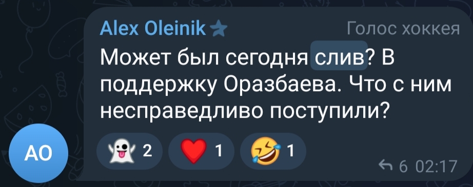 Олейник, капец горе эксперт и журналист, который несет откровенный бред! Во-первых он говорит, что в Барысе не было легионеров, потом наши игроки типа расслабились и потеряли форму!! Так вот горе журналист, Барыс в начале сезона был забит под завязку иностранными игроками, то бишь легионерами, в том числе и российскими игроками, которые как я понял для олейника не легионарами! В прошлом году Сборная под руководством другого ГТ, которого ты не особо любишь сохранила прописку в Элите!! При этом в Сборной играли игроки Барыса, и Барыс так же провально провел сезон!! Были случаи, когда Барыс замечательно провел сезон, но с треском вылетатал на ОИ или впердив! То есть это доказательство того, что результат Барыса не надо увязывать со Сборной!! Потом ты постоянно говоришь про то, что на отборах мы вынесли венгров, но молчишь то, что Сборная во главе с Болякин провалила отбор на ОИ!! И это произошло в начале сезона!! И как это тогда должно увязаться с результатами Барыса? Опять же, что там говоришь про результаты Барыса и игроков, но почему-то упорно молчишь, что в Сборной играли не только игроки Барыса!! Михайлис, Шестаков, Орехов, Метальников, Бреус (из системы КХЛ), Лихотников, Волков, Михайлов, Колесников из ЧК!! Рымарев из ВХЛ!! Как минимум 10 человек не из Барыса!! Так о каком Барысе тогда идёт речь? Опять же говоришь про то, что нет игроков, не даёт им набраться опыта(((. Опять без опыта хорошего чемпионата как ты сам сказал это будет не опыт, а избиение!! Поэтому и нужно пропускать молодёжь через сильный чемпионат, чтобы Сборная боролась на медали, на не за сохранение прописки! Очередной раз убеждаюсь, что олейник это шовик балаболка, которая боится за свой гнилой ливер! Поэтому про ушедших Оразбаева он наговорил, а вот про действущих лиц из КФХ очконул!! Такой слизень. Которые хочет пролезть сквозь струйки!