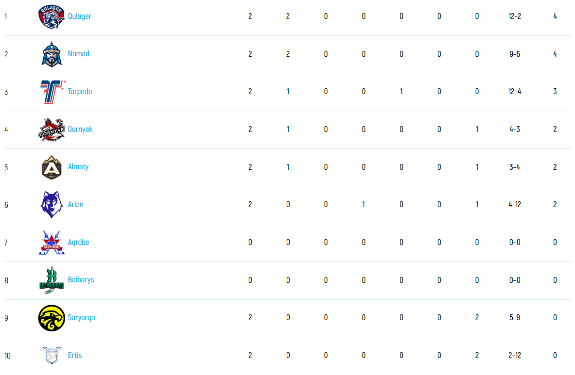 Завершились первые матчи регулярного чемпионата Pro Hokei Ligasy. Петропавловский "Кулагер" на старте сезона дважды обыграл "Иртыш" с общим счётом 12:2 и возглавил турнирную таблицу.