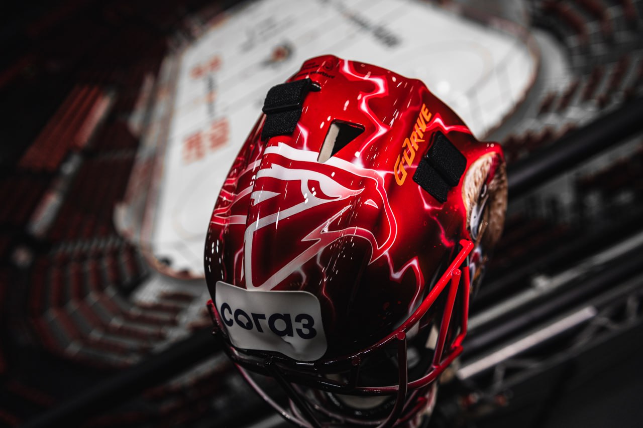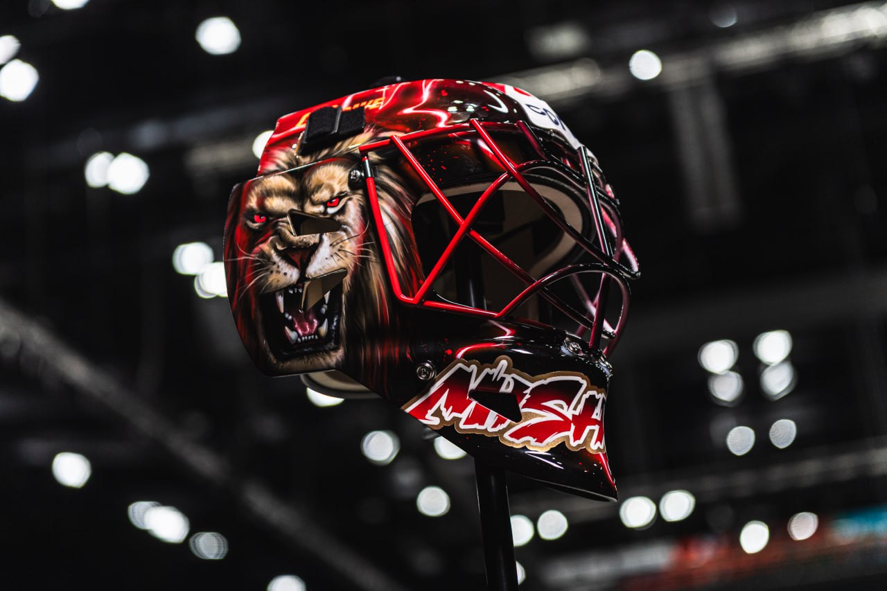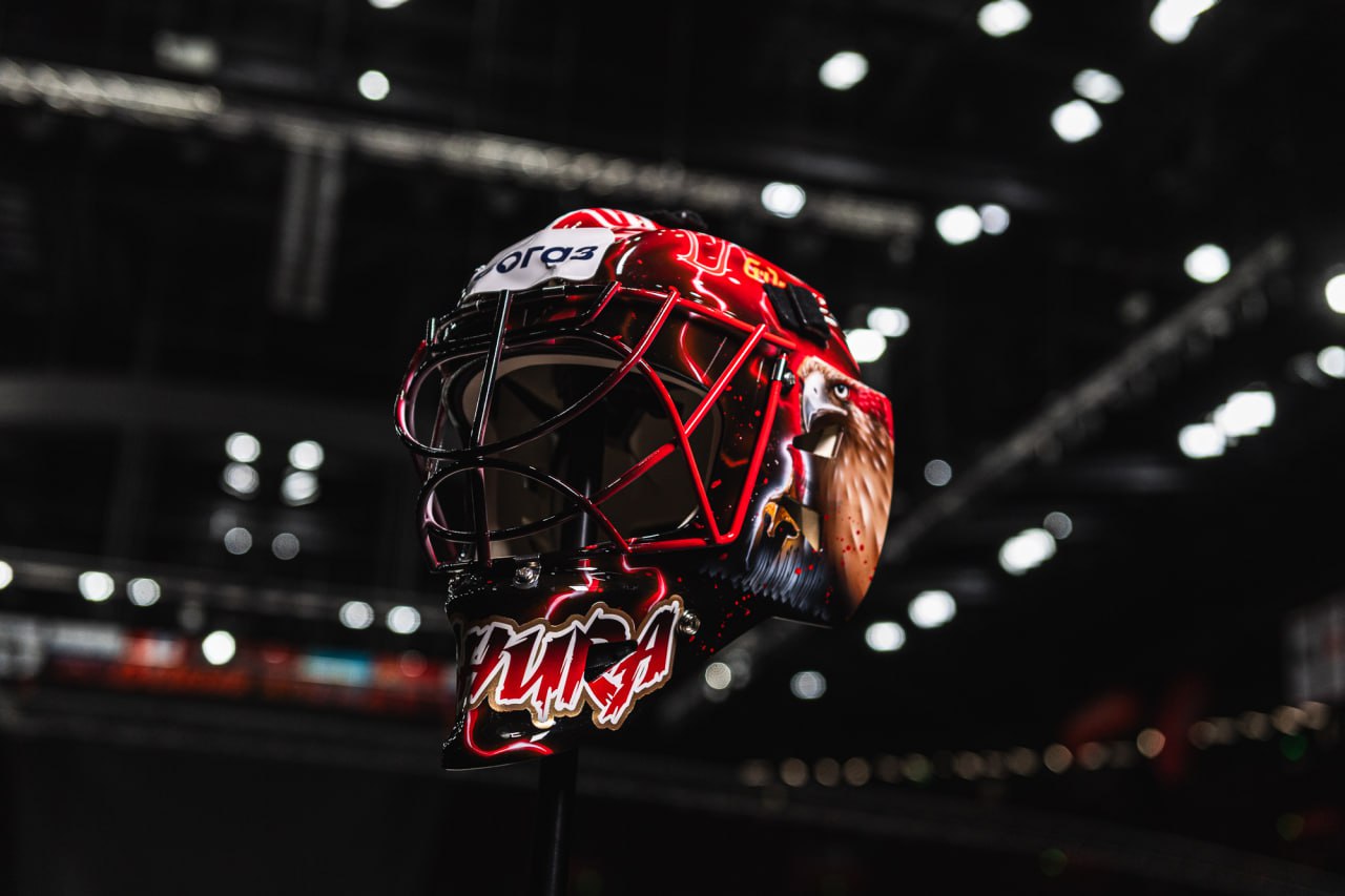 Вратарь "Авангарда" Андрей Мишуров показал свой новый шлем. На маске изображён символ клуба ястреб, а также лев и спартанцы.
