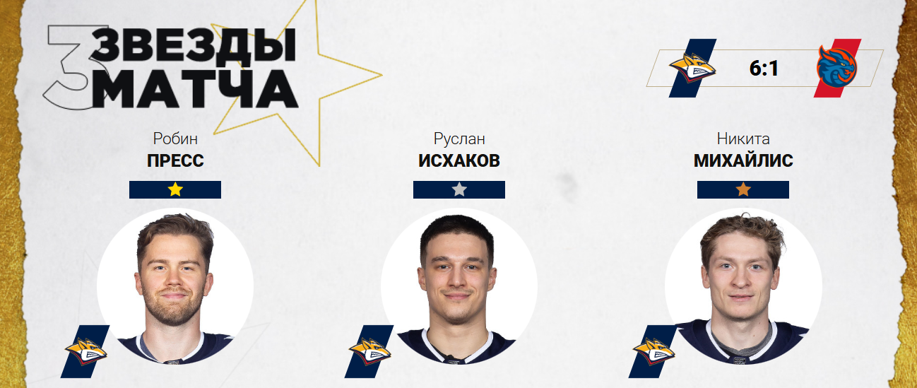 Форвард магнитогорской команды и сборной Казахстана Никита Михайлис отметился заброшенной шайбой и результативной передачей и был признан третьей звездой встречи.