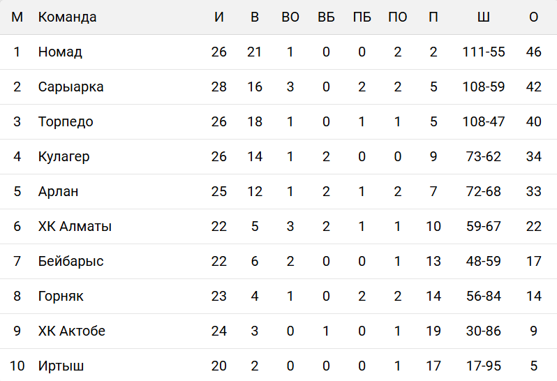 Астанинский "Номад" продолжает лидировать в турнирной таблице Pro Hokei Ligasy. Столичный клуб побеждает семь матчей подряд, а в последних 18 встречах потерпел лишь одно поражение. На счету подопечных Константина Пушкарёва 46 очков в 26 играх.