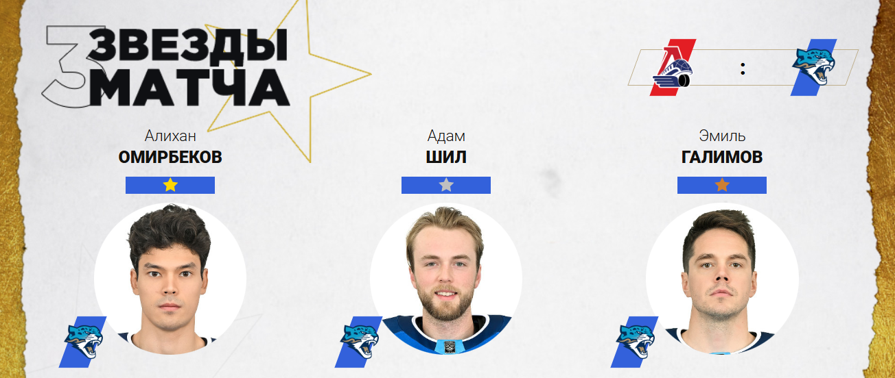 Алихан Омирбеков стал автором заброшенной шайбы и признан первой звездой встречи, голкипер Адам Шил отразил все 27 бросков и стал второй звездой. Вернувшийся в строй после травмы Эмиль Галимов набрал 2 (1+1) очка и стал третьей звездой матча.