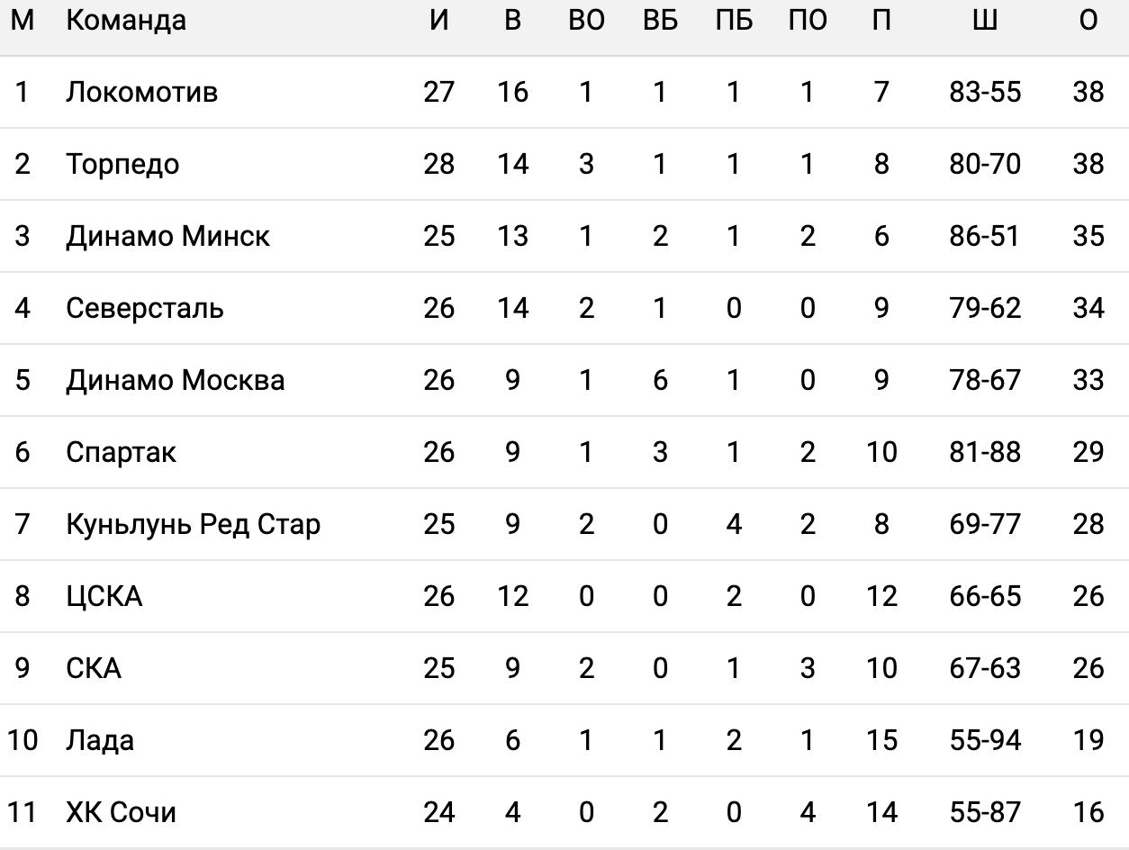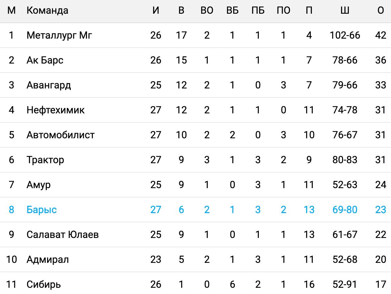 Лидирует на Востоке "Металлург" с 42 очками в 26 играх.