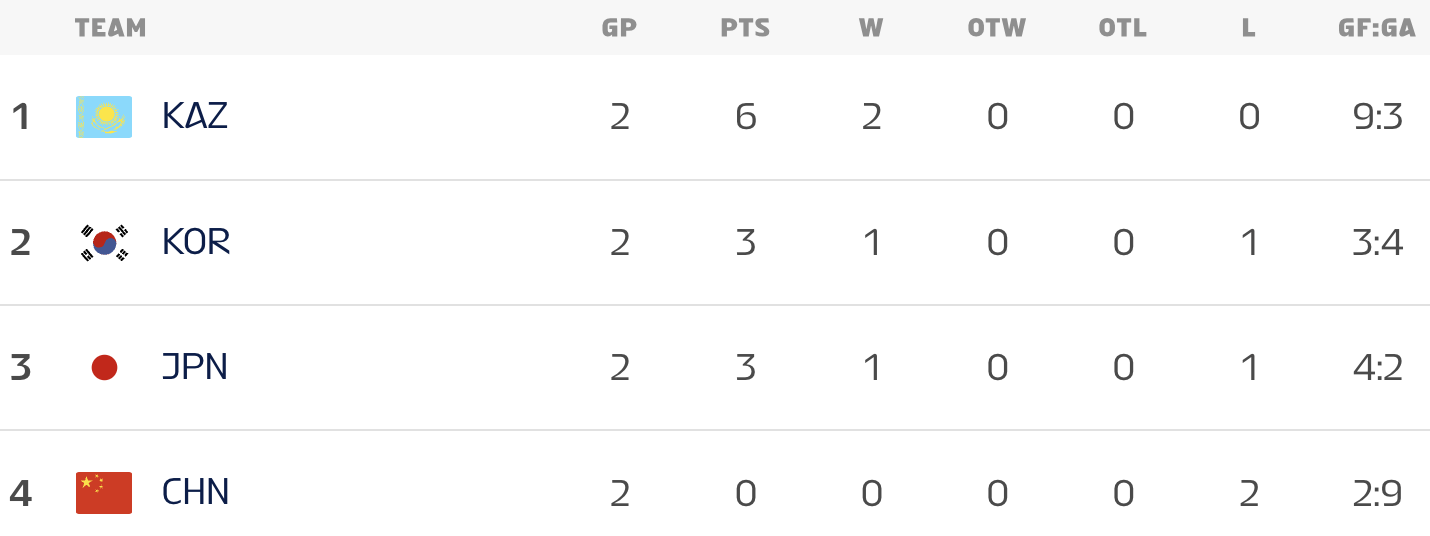 Казахстанцы лидируют, набрав шесть очков в двух встречах, на втором месте расположилась Южная Корея, тройку лидеров замыкает сборная Японии.