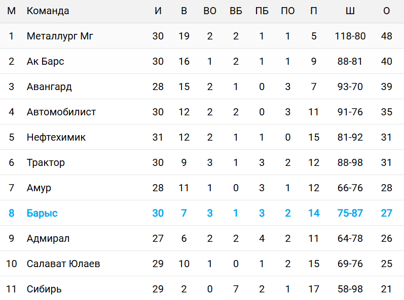 Астанинский "Барыс" провёл 30 матчей и с 27 очками занимает восьмое место в турнирной таблице Восточной конференции. Идущий на седьмом месте "Амур" опережает астанчан всего на один балл, но имеет матч в запасе.