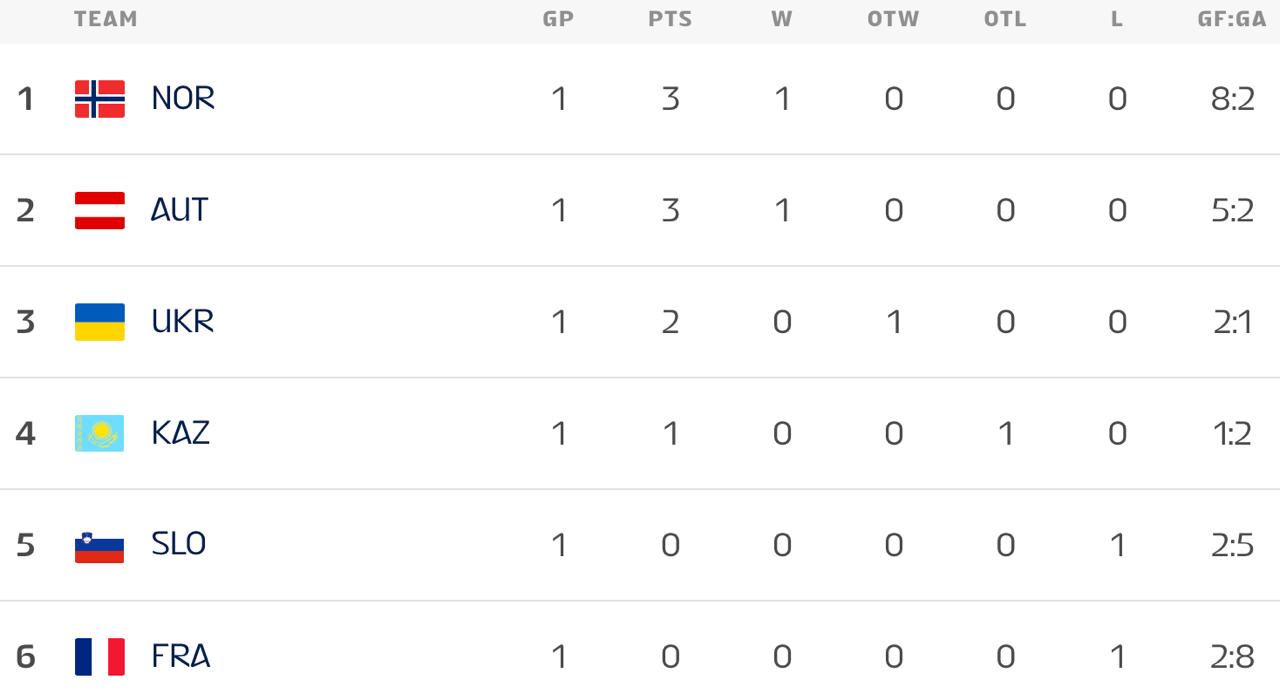 Завершился первый игровой день молодёжного чемпионата мира. Сборная Норвегии разгромила Францию (8:2), Австрия уверенно переиграла Словению (5:2), Казахстан в овертайме проиграл Украине (1:2).