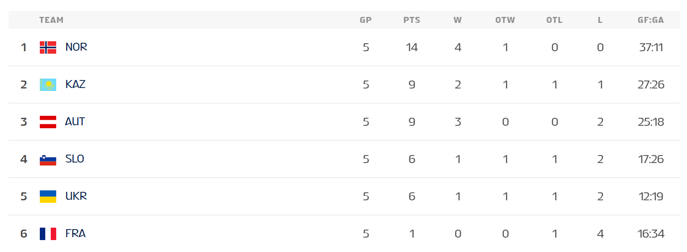 Сборная Казахстана на турнире набрала девять очков в пяти матчах и заняла второе место. Норвегия завершила чемпионат мира без поражений, заняла первое место и в следующем году будет выступать в элитном дивизионе. Сборная Франции с одним баллом в пяти встречах расположилась на последнем месте и вылетела в группу "В" первого дивизиона.
