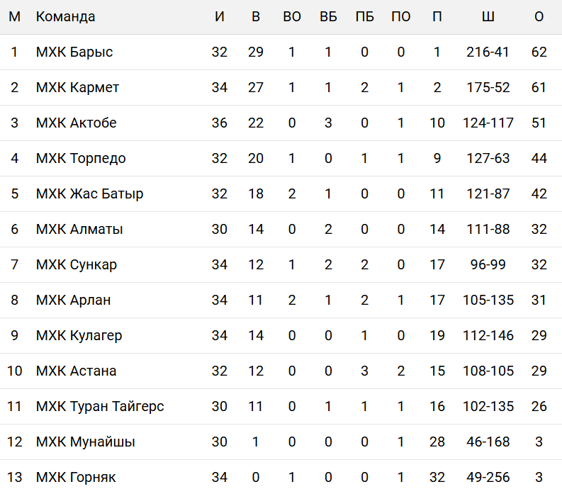 Первое место в таблице продолжает занимать "Барыс". Столичный коллектив набрал 62 очка в 32 матчах. Также астанинцы показывают лучшую результативность и уже забросили 216 шайб, что является лучшим показателем в лиге.