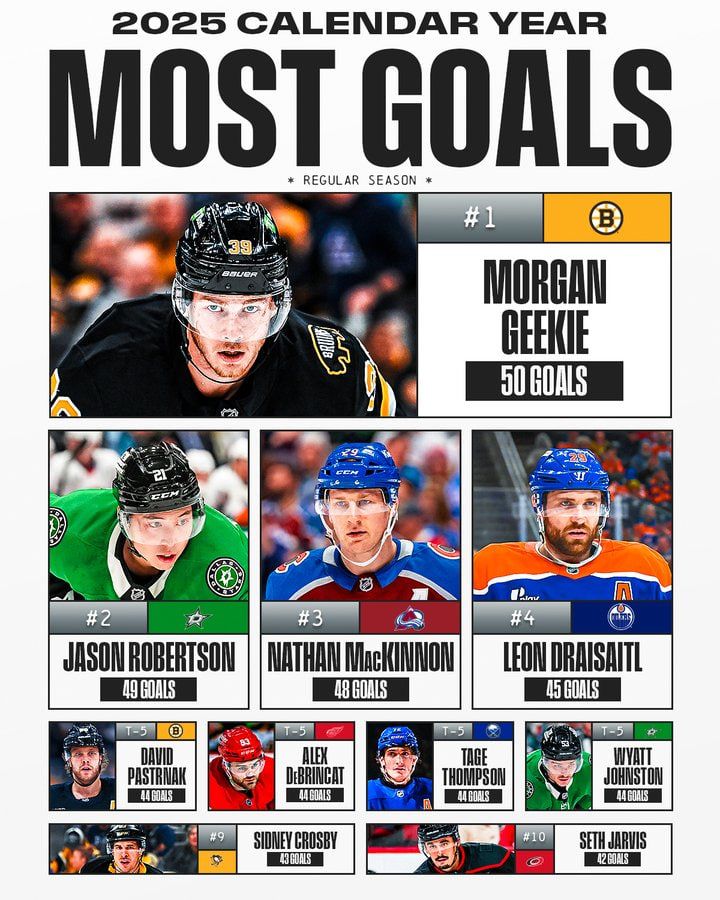 Пресс-служба Национальной хоккейной лиги опубликовала пост с лучшими снайперами 2025 года на данный момент.