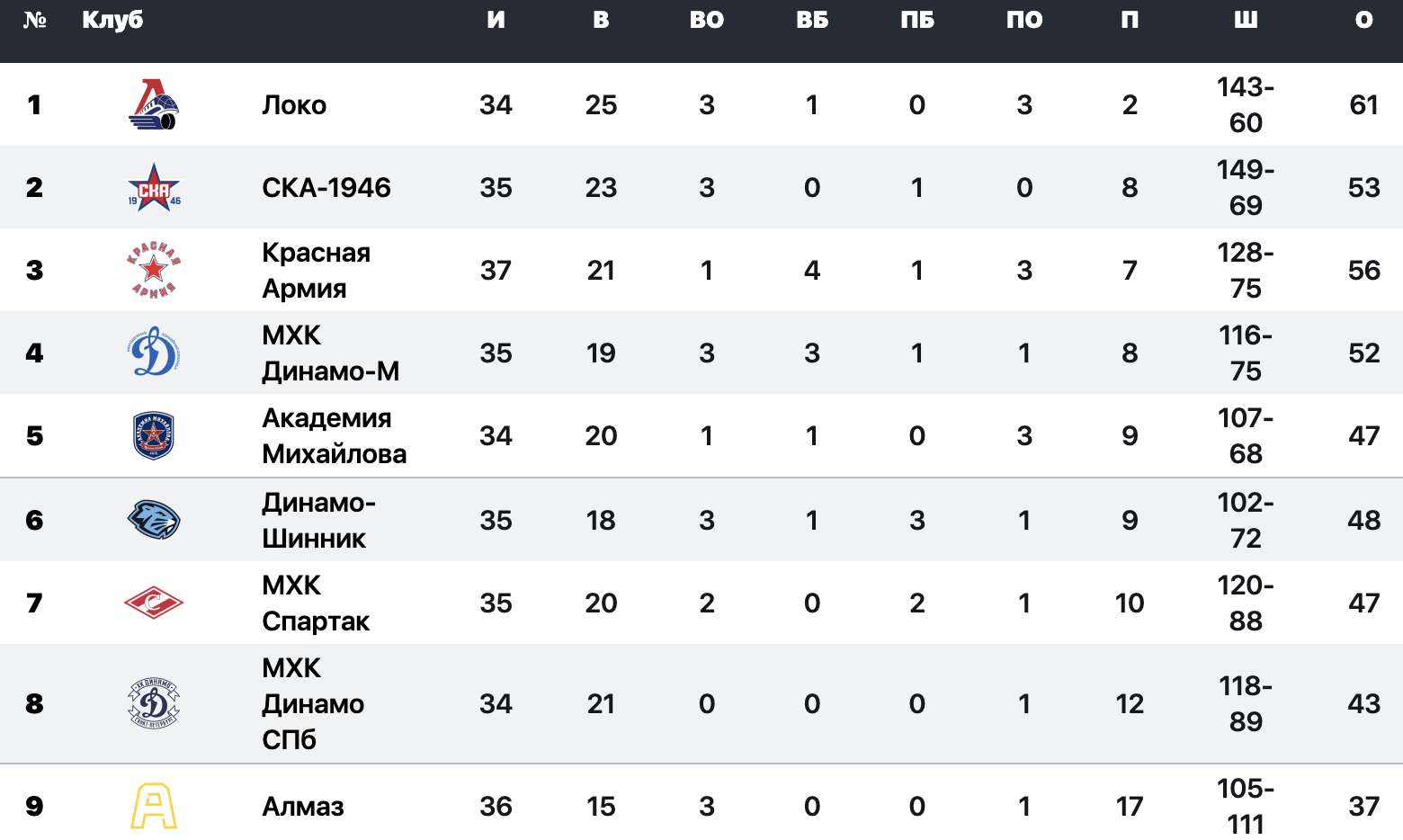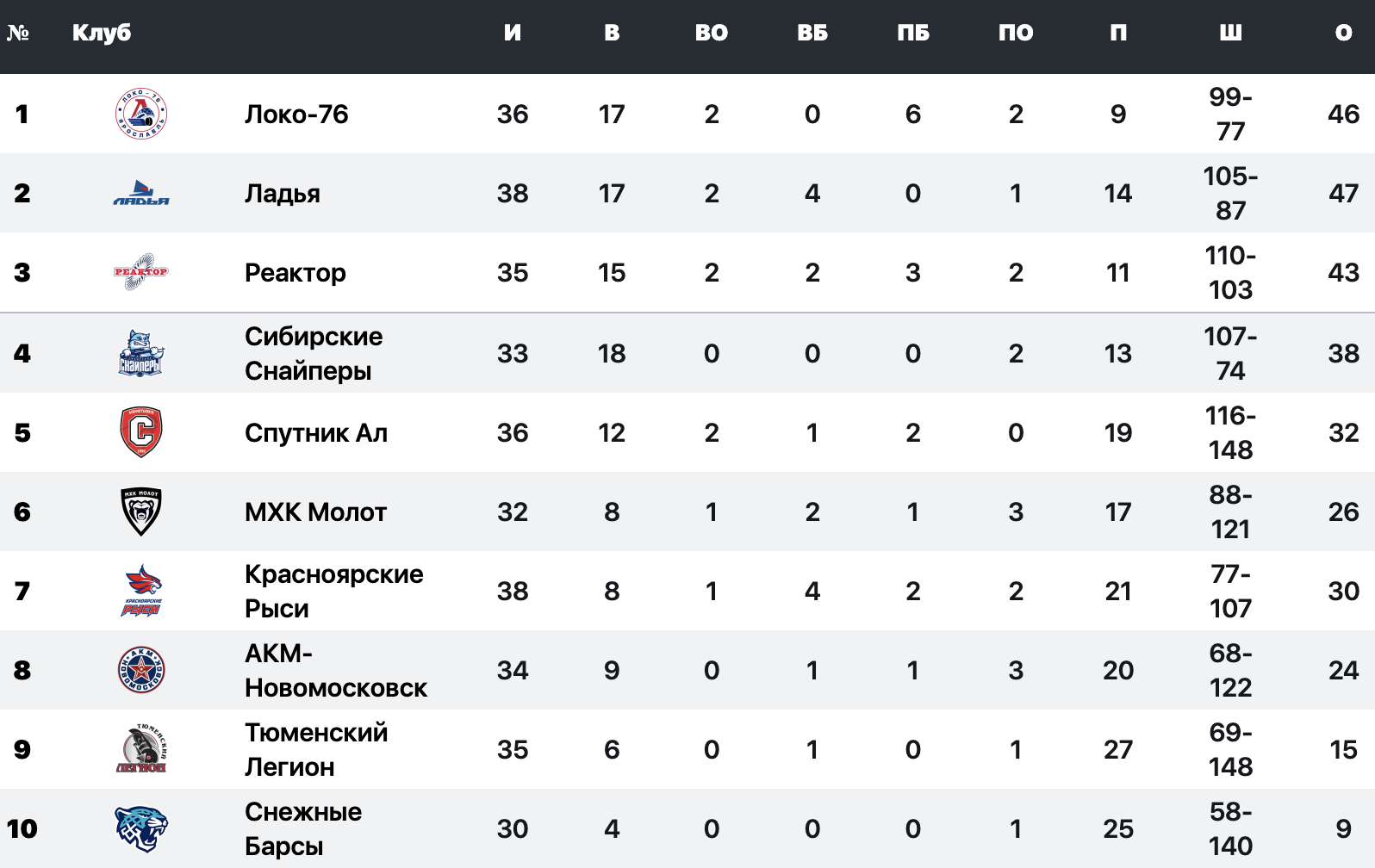 На первом месте золотого дивизиона Западной конференции расположился "Локо". В 34 играх ярославцы набрали 61 очко.