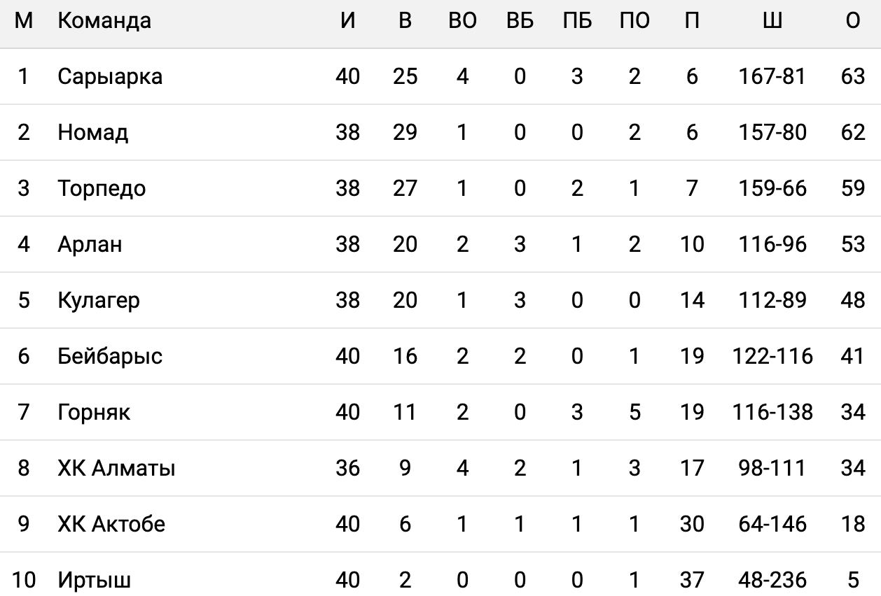 Карагандинская "Сарыарка" возглавила турнирную таблицу Pro Hokei Ligasy. В активе подопечных Владимира Князева 63 очка, набранных в 40 встречах регулярного чемпионата.