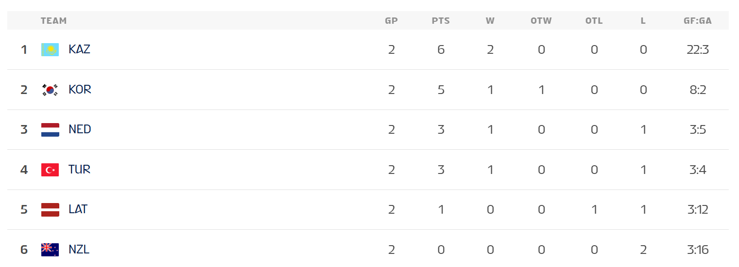 Сборная Казахстана одержала две уверенные победы, разгромив Новую Зеландию (13:2) и Латвию (9:1), и занимает первое место в турнирной таблице.