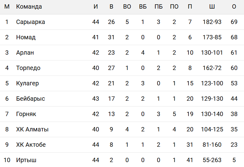 Все команды Pro Hokei Ligasy провели более 40 матчей в регулярном чемпионате. На первое место в турнирной таблице вышла карагандинская "Сарыарка", в активе которой 69 баллов в 44 матчах.