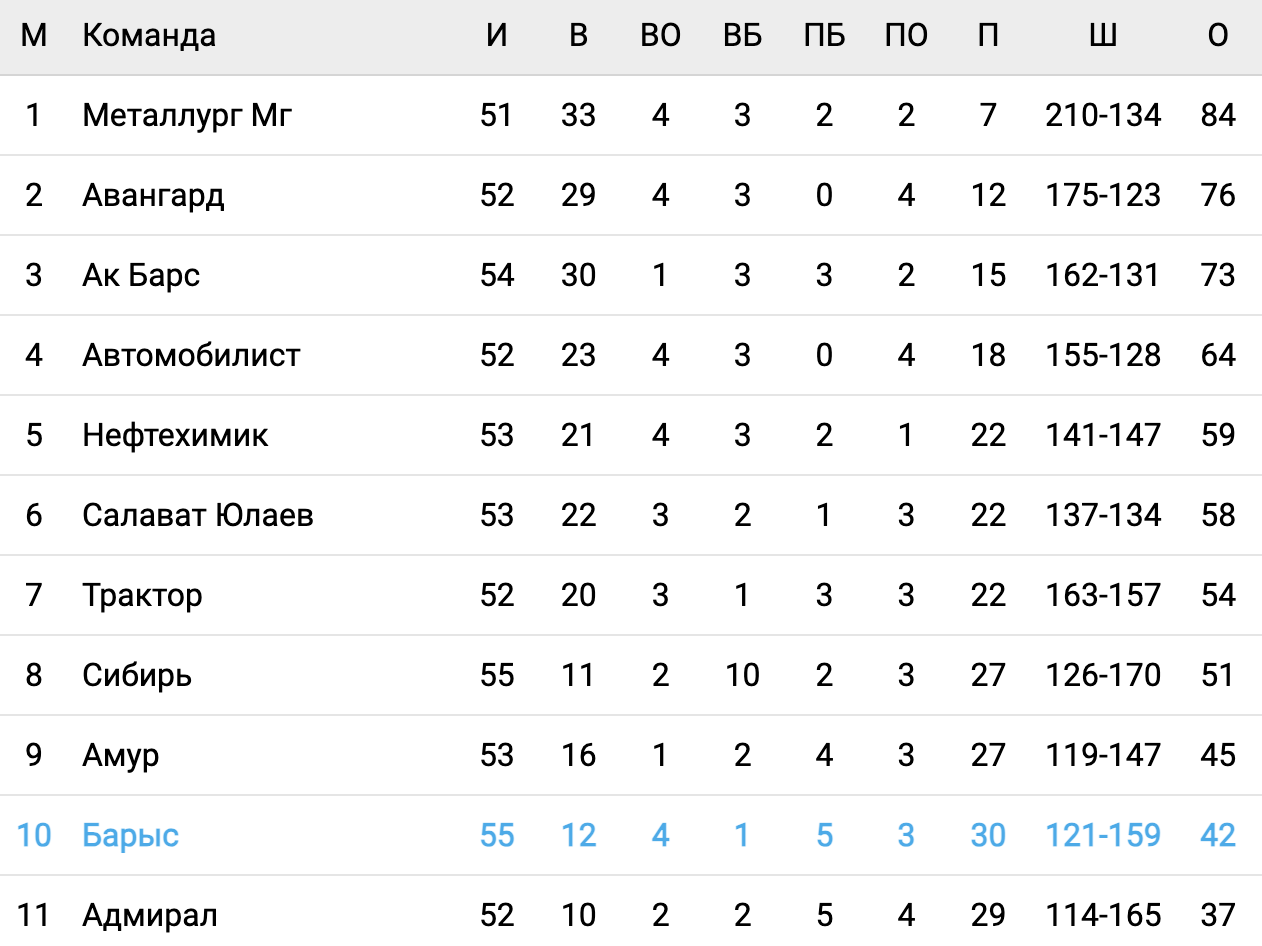 Астанинский "Барыс" занимает десятое место в турнирной таблице Восточной конференции, имея в активе 42 очка в 55 матчах, и находится вне зоны плей-офф.