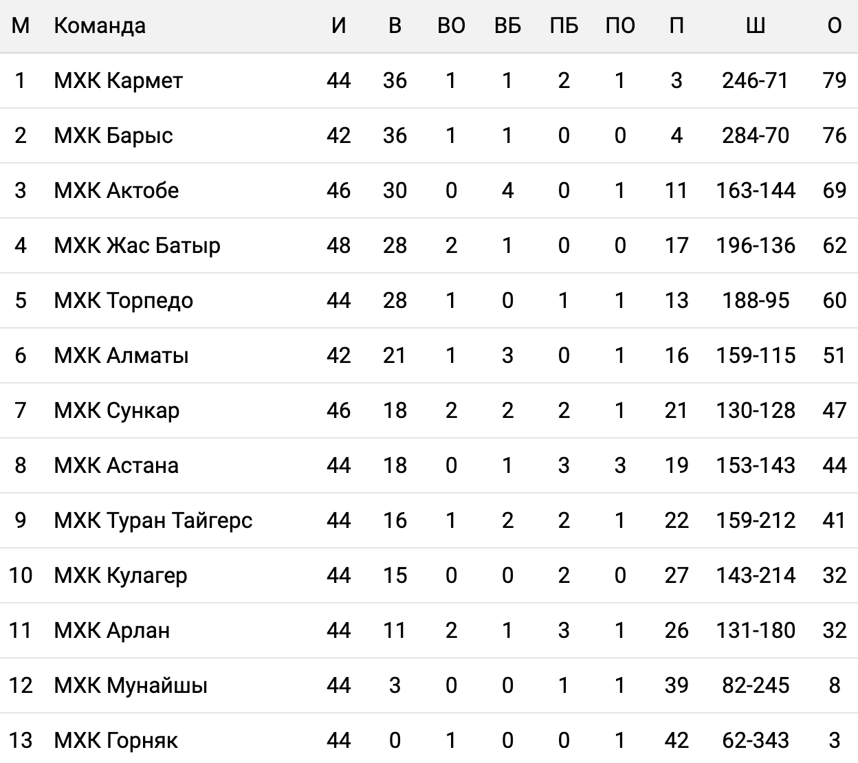 На первом месте расположился "Кармет". В активе карагандинцев 79 очков, набранных в 44 встречах.
