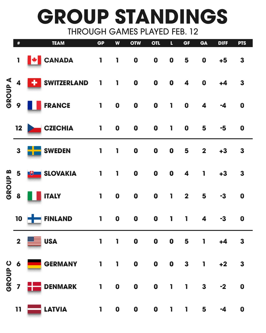 В группе "А" на данный момент лидируют Канада и Швейцария, одержавшие победы в стартовых матчах. Швеция и Словакия возглавляют группу "В", а США и Германия на первых позициях в группе "С".