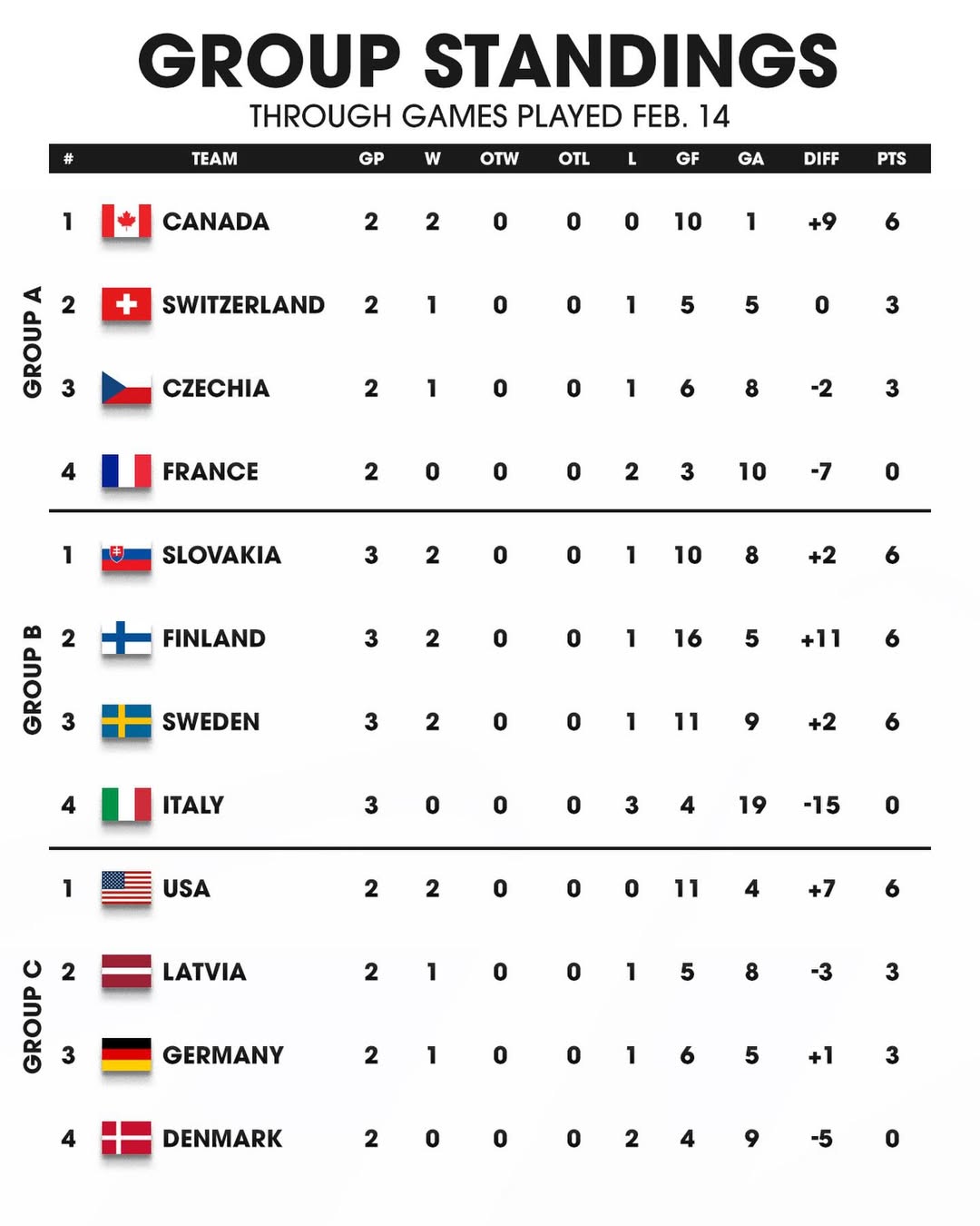 15 февраля пройдут заключительные матчи в группе "А" и группе "С". Ранее Канада стала первым четвертьфиналистом, также Словакия вышла напрямую в 1/4, выиграв группу "В".