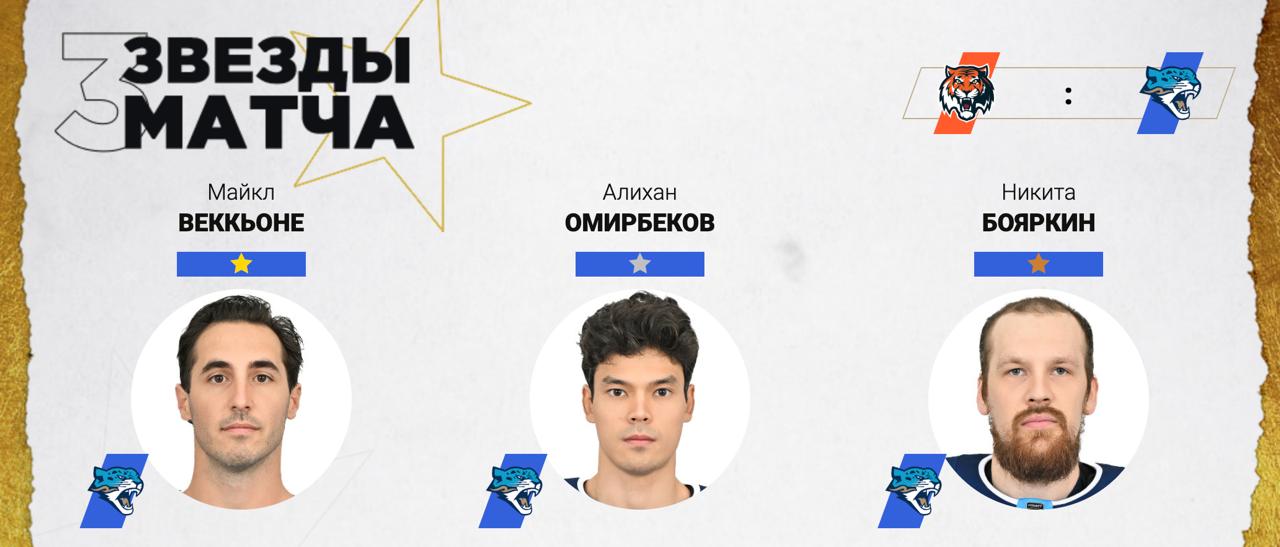Форвард "барсов" Алихан Омирбеков забросил шайбу, выиграл восемь вбрасываний и стал второй звездой встречи.