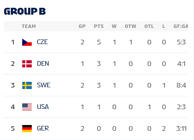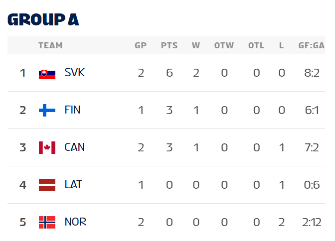 Лидером группы "А" на данный момент является Словакия. Команда провела два матча, в которых одержала победы. Аналогичная ситуация в группе "В", где первое место занимает Чехия.
